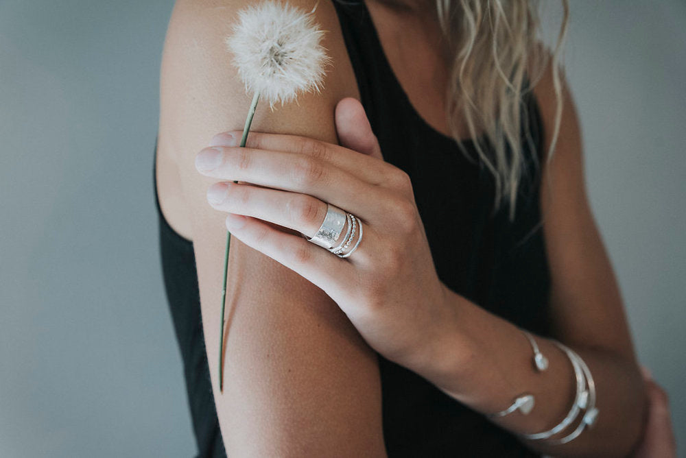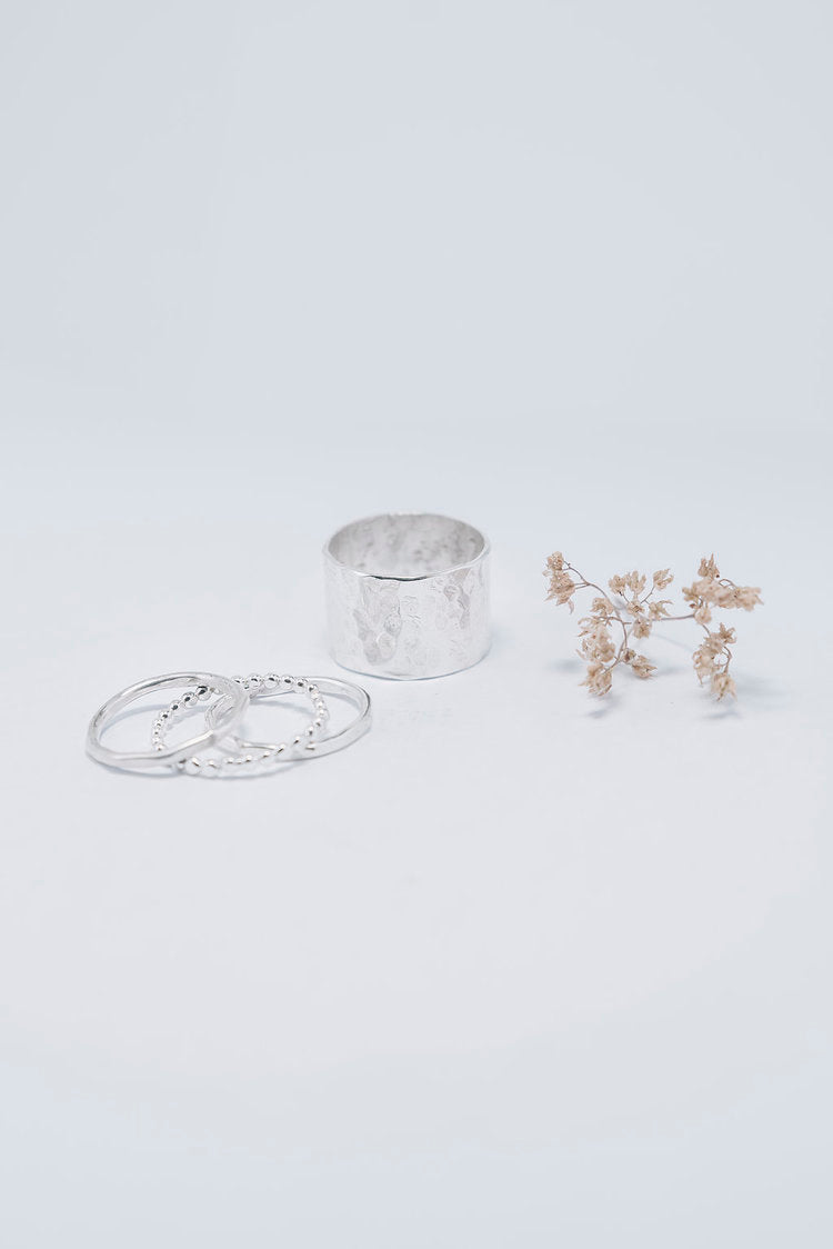 A classic Ebb + Flow staple, the hammered wide band ring alongside two hammered stacking rings and one beaded stacking ring,